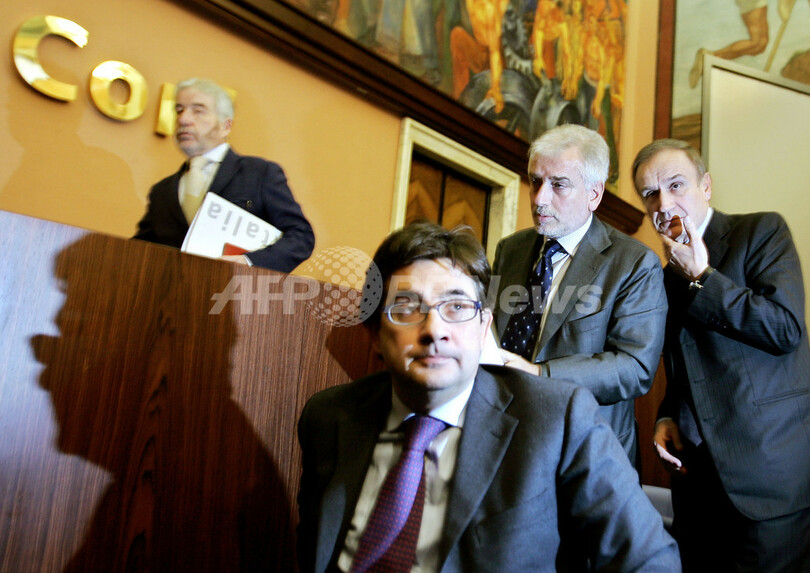 写真は、会議後の会見に臨むペトルー五輪委員会会長(右)パンカリ伊サッカー連盟代表(左)。(c)AFP/Filippo MONTEFORTE