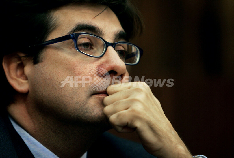 写真は、会議後の会見に臨むペトルー五輪委員会会長(右)パンカリ伊サッカー連盟代表(左)。(c)AFP/Filippo MONTEFORTE