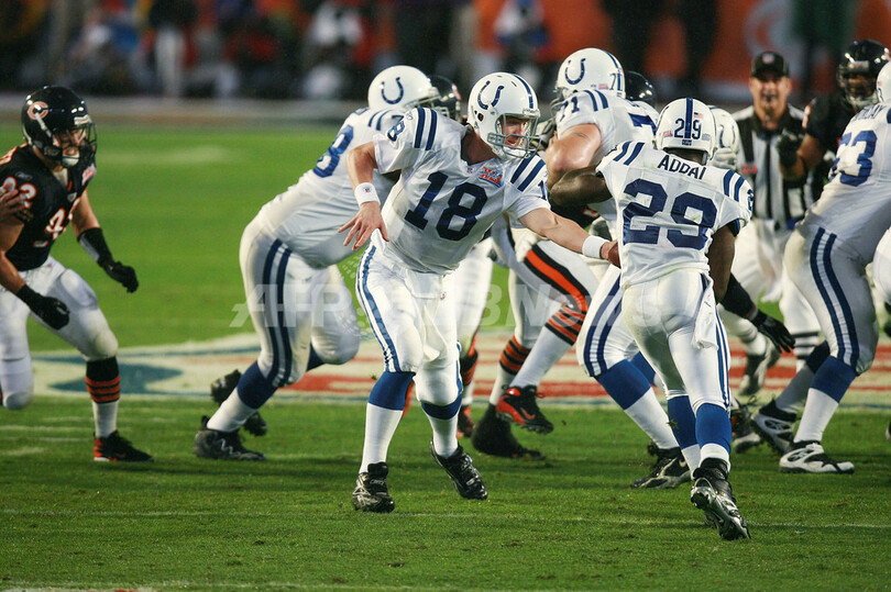 【マイアミガーデンズ/米国 4日 AFP】NFL、第41回スーパーボウル(Super Bowl XLI)、シカゴ・ベアーズ(Chicago Bears)vsインディアナポリス・コルツ(Indianapolis Colts)。試合は29-17でコルツが勝利し36年振りに2度目となるスーパーボウル制覇を果たした。写真は、選手に指示を出すコルツのQBペイトン・マニング(Peyton Manning)。(c)AFP/Getty Images Donald Miralle