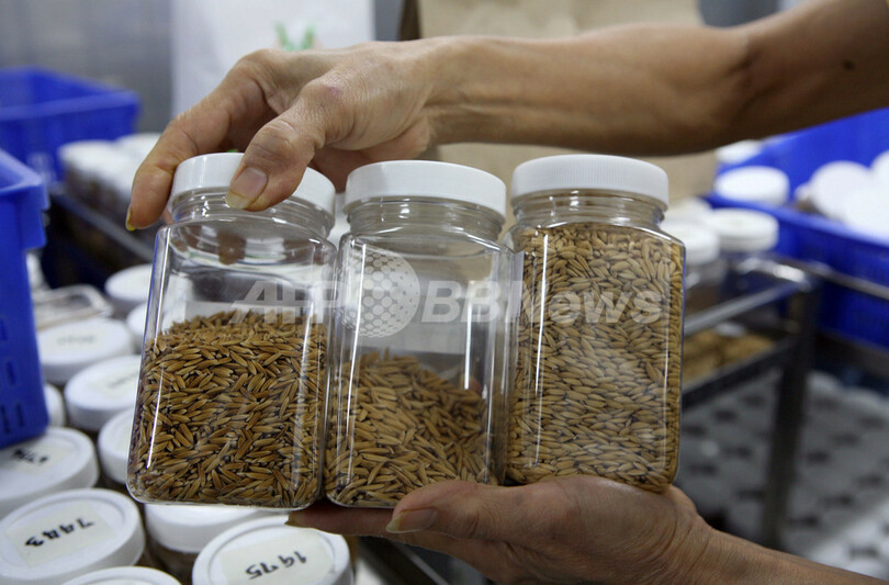 写真は1月24日、バンコク郊外の同研究所に保存されている各種のイネの種が入った瓶。(c)AFP/Saeed KHAN