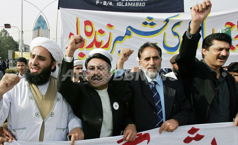 【イスラマバード/パキスタン 5日 AFP】首都イスラマバード(Islamabad)で5日、同日をカシミール地方の団結を示す日、Kashmir Solidarity Dayとして、インド側のカシミール地方を実効支配するインド政府に対するデモ行進が行われた。同地方の分離独立を求め、1989年にイスラム過激派がインド軍に対する武装闘争を開始して以来、戦闘は激化している。政府は、情勢の混乱でこれまでに4万4000人以上が死亡したと発表しているが、分離独立を求める勢力は犠牲者の数をその2倍にのぼるとみている。核保有国であるインド、パキスタン両国は2004年1月、カシミール地方をめぐる60年におよぶ対立を収束させるため、和平プロセスの協議を始めた。両国は同地方を部分的に支配。地方全土の領有を主張している。写真は5日、デモ行進に参加する人々。(c)AFP/Aamir QURESHI