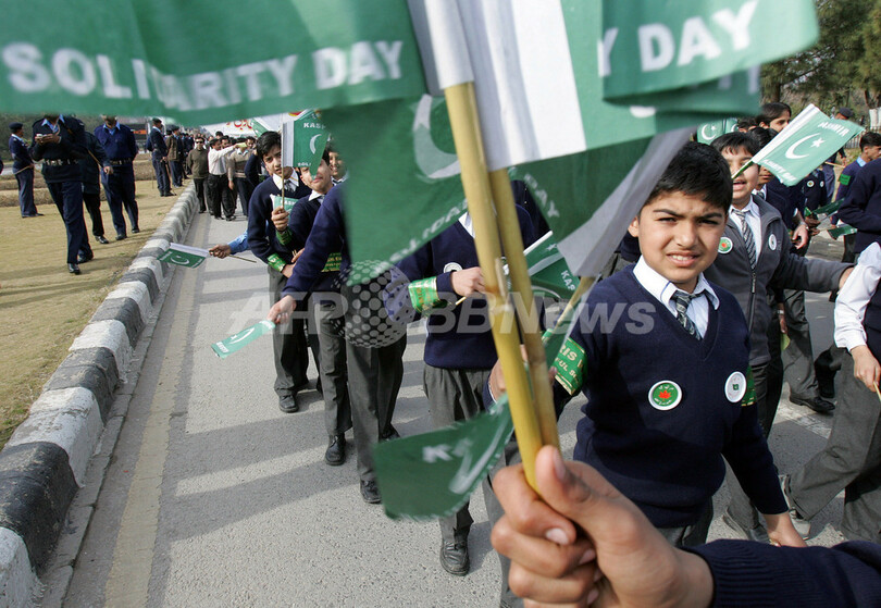 【イスラマバード/パキスタン 5日 AFP】首都イスラマバード(Islamabad)で5日、同日をカシミール地方の団結を示す日、Kashmir Solidarity Dayとして、インド側のカシミール地方を実効支配するインド政府に対するデモ行進が行われた。同地方の分離独立を求め、1989年にイスラム過激派がインド軍に対する武装闘争を開始して以来、戦闘は激化している。政府は、情勢の混乱でこれまでに4万4000人以上が死亡したと発表しているが、分離独立を求める勢力は犠牲者の数をその2倍にのぼるとみている。核保有国であるインド、パキスタン両国は2004年1月、カシミール地方をめぐる60年におよぶ対立を収束させるため、和平プロセスの協議を始めた。両国は同地方を部分的に支配。地方全土の領有を主張している。写真は5日、デモ行進に参加する人々。(c)AFP/Aamir QURESHI