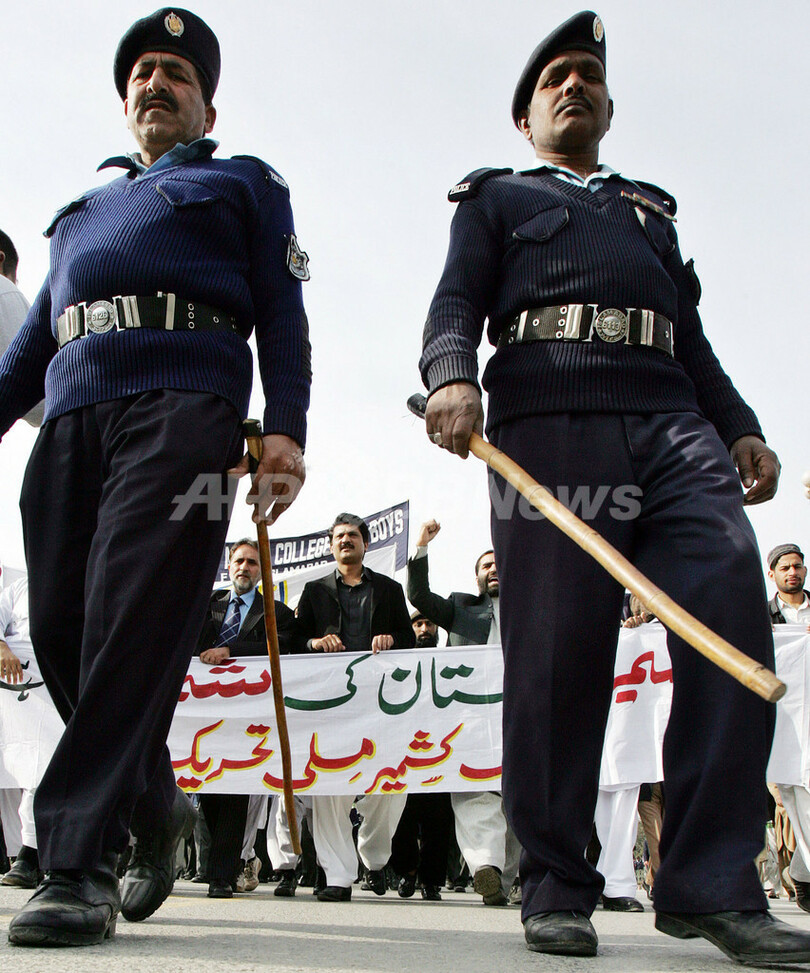 【イスラマバード/パキスタン 5日 AFP】首都イスラマバード(Islamabad)で5日、同日をカシミール地方の団結を示す日、Kashmir Solidarity Dayとして、インド側のカシミール地方を実効支配するインド政府に対するデモ行進が行われた。同地方の分離独立を求め、1989年にイスラム過激派がインド軍に対する武装闘争を開始して以来、戦闘は激化している。政府は、情勢の混乱でこれまでに4万4000人以上が死亡したと発表しているが、分離独立を求める勢力は犠牲者の数をその2倍にのぼるとみている。核保有国であるインド、パキスタン両国は2004年1月、カシミール地方をめぐる60年におよぶ対立を収束させるため、和平プロセスの協議を始めた。両国は同地方を部分的に支配。地方全土の領有を主張している。写真は5日、デモ行進に参加する人々。(c)AFP/Aamir QURESHI