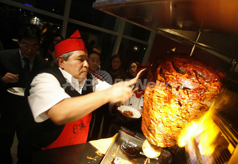 写真は30日、北京市の「El Fogoncito」開店イベントで、レストランの出資者らが見守る中、回転させて焼いた肉をトルティーヤ(とうもろこしの粉で作ったクレープ状の皮)の上にスライスして乗せるメキシコ人シェフ。(c)AFP/Frederic J. BROWN