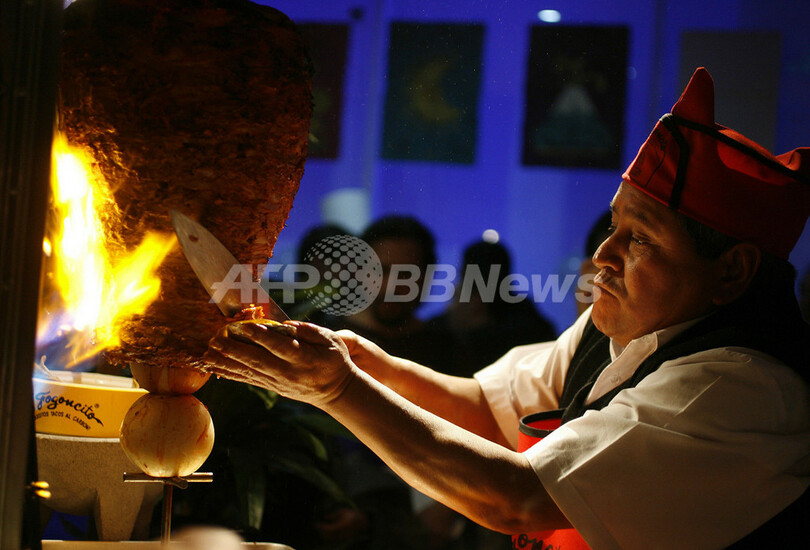 写真は30日、北京市の「El Fogoncito」開店イベントで、レストランの出資者らが見守る中、回転させて焼いた肉をトルティーヤ(とうもろこしの粉で作ったクレープ状の皮)の上にスライスして乗せるメキシコ人シェフ。(c)AFP/Frederic J. BROWN