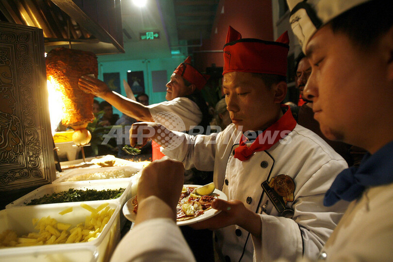 写真は30日、北京市の「El Fogoncito」開店イベントで、レストランの出資者らが見守る中、回転させて焼いた肉をトルティーヤ(とうもろこしの粉で作ったクレープ状の皮)の上にスライスして乗せるメキシコ人シェフ。(c)AFP/Frederic J. BROWN