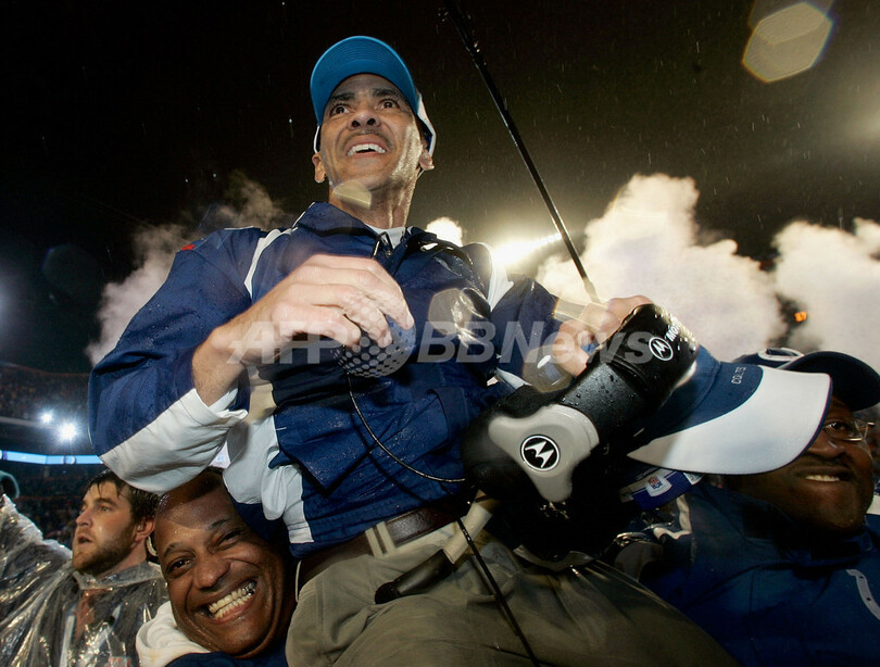 【マイアミガーデンズ/米国 4日 AFP】NFL、第41回スーパーボウル(Super Bowl XLI)、シカゴ・ベアーズ(Chicago Bears)vsインディアナポリス・コルツ(Indianapolis Colts)。試合は29-17でコルツが勝利し36年振りに2度目となるスーパーボウル制覇を果たした。写真は、試合終了後ロッカールームに戻り、ヴィンス・ロンバルディ・トロフィー(Vince Lombardi trophy)を高々と掲げるコルツの選手。(c)AFP/Getty Images Donald Miralle