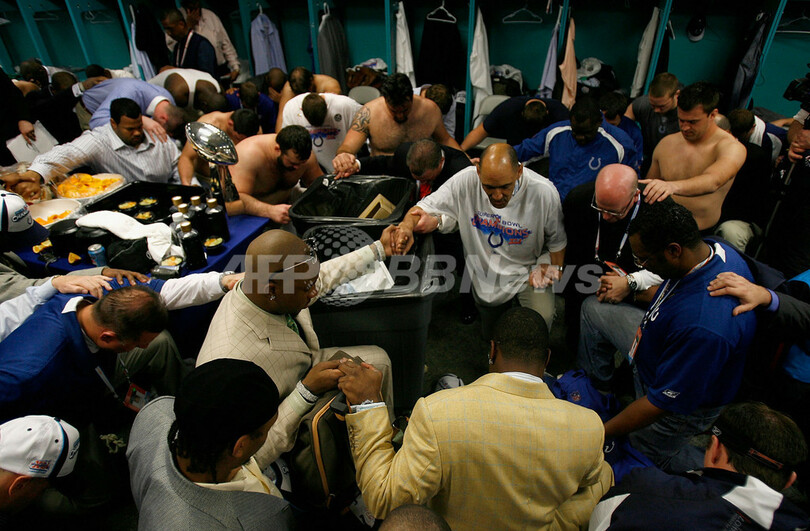 【マイアミガーデンズ/米国 4日 AFP】NFL、第41回スーパーボウル(Super Bowl XLI)、シカゴ・ベアーズ(Chicago Bears)vsインディアナポリス・コルツ(Indianapolis Colts)。試合は29-17でコルツが勝利し36年振りに2度目となるスーパーボウル制覇を果たした。写真は、試合終了後ロッカールームに戻り、ヴィンス・ロンバルディ・トロフィー(Vince Lombardi trophy)を高々と掲げるコルツの選手。(c)AFP/Getty Images Donald Miralle