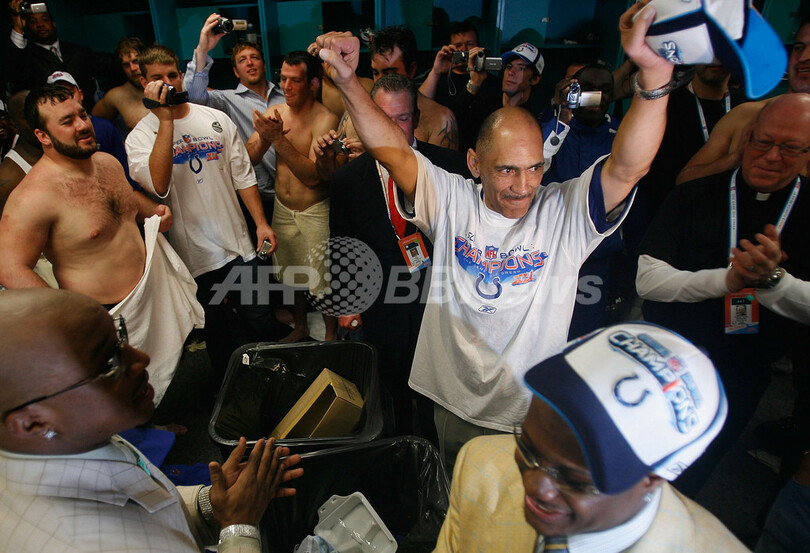 【マイアミガーデンズ/米国 4日 AFP】NFL、第41回スーパーボウル(Super Bowl XLI)、シカゴ・ベアーズ(Chicago Bears)vsインディアナポリス・コルツ(Indianapolis Colts)。試合は29-17でコルツが勝利し36年振りに2度目となるスーパーボウル制覇を果たした。写真は、試合終了後ロッカールームに戻り、ヴィンス・ロンバルディ・トロフィー(Vince Lombardi trophy)を高々と掲げるコルツの選手。(c)AFP/Getty Images Donald Miralle