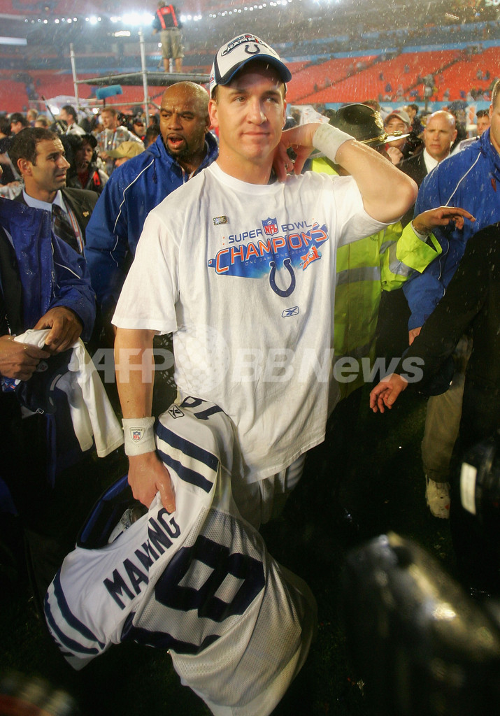 【マイアミガーデンズ/米国 4日 AFP】NFL、第41回スーパーボウル(Super Bowl XLI)、シカゴ・ベアーズ(Chicago Bears)vsインディアナポリス・コルツ(Indianapolis Colts)。試合は29-17でコルツが勝利し36年振りに2度目となるスーパーボウル制覇を果たした。写真は、試合終了後ロッカールームに戻り、ヴィンス・ロンバルディ・トロフィー(Vince Lombardi trophy)を高々と掲げるコルツの選手。(c)AFP/Getty Images Donald Miralle