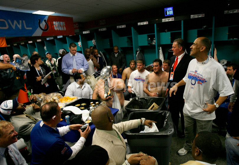 【マイアミガーデンズ/米国 4日 AFP】NFL、第41回スーパーボウル(Super Bowl XLI)、シカゴ・ベアーズ(Chicago Bears)vsインディアナポリス・コルツ(Indianapolis Colts)。試合は29-17でコルツが勝利し36年振りに2度目となるスーパーボウル制覇を果たした。写真は、試合終了後ロッカールームに戻り、ヴィンス・ロンバルディ・トロフィー(Vince Lombardi trophy)を高々と掲げるコルツの選手。(c)AFP/Getty Images Donald Miralle