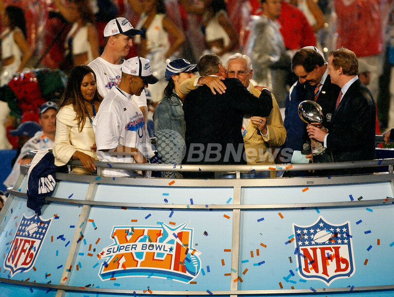 【マイアミガーデンズ/米国 4日 AFP】NFL、第41回スーパーボウル(Super Bowl XLI)、シカゴ・ベアーズ(Chicago Bears)vsインディアナポリス・コルツ(Indianapolis Colts)。試合は29-17でコルツが勝利し36年振りに2度目となるスーパーボウル制覇を果たした。写真は、試合終了後ロッカールームに戻り、ヴィンス・ロンバルディ・トロフィー(Vince Lombardi trophy)を高々と掲げるコルツの選手。(c)AFP/Getty Images Donald Miralle