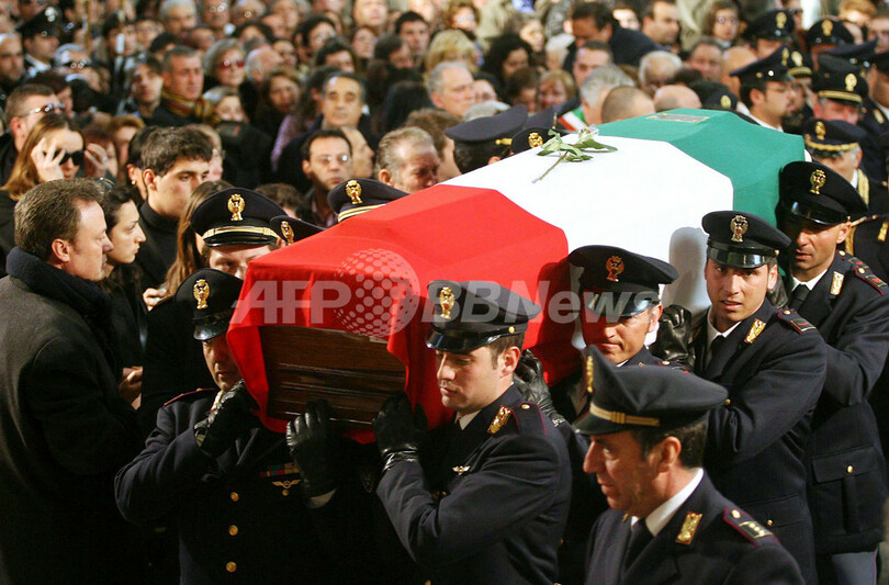 写真は、イタリア国旗に覆われて運ばれるラチティさんの棺。(c)AFP/MARCELLO PATERNOSTRO
