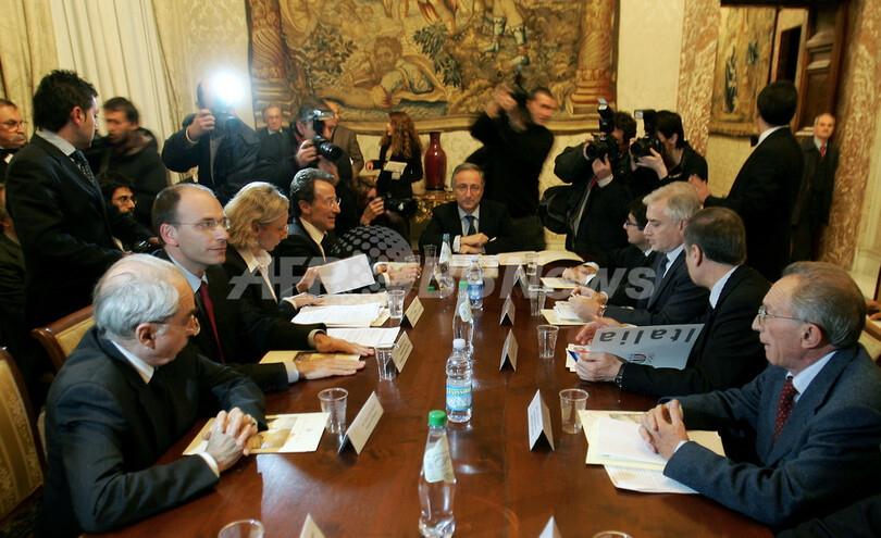 写真は、会合に臨むくアマート内相(左手前)、ジョヴァンナ・メランドリ(Giovanna Melandri)スポーツ・文部科学大臣(左3)、ペトルー会長(右2)、パンカリ代表(右4)ら。(c)AFP/FILIPPO MONTEFORTE