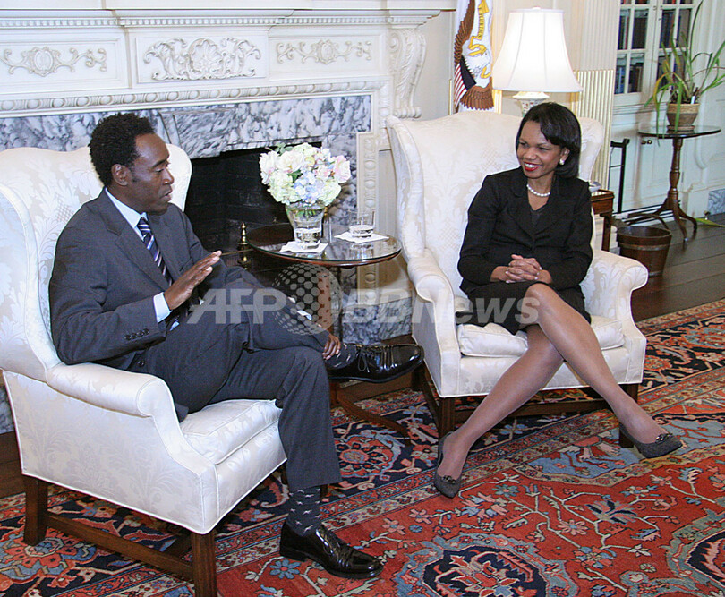 写真は米国務省で同日、ダルフールでの人道危機への関心を喚起するキャンペーンに参加する俳優のドン・チードル(Don Cheadle)さんと会見するコンドリーザ・ライス(Condoleezza Rice)国務長官(右)。(c)AFP/Karen BLEIER