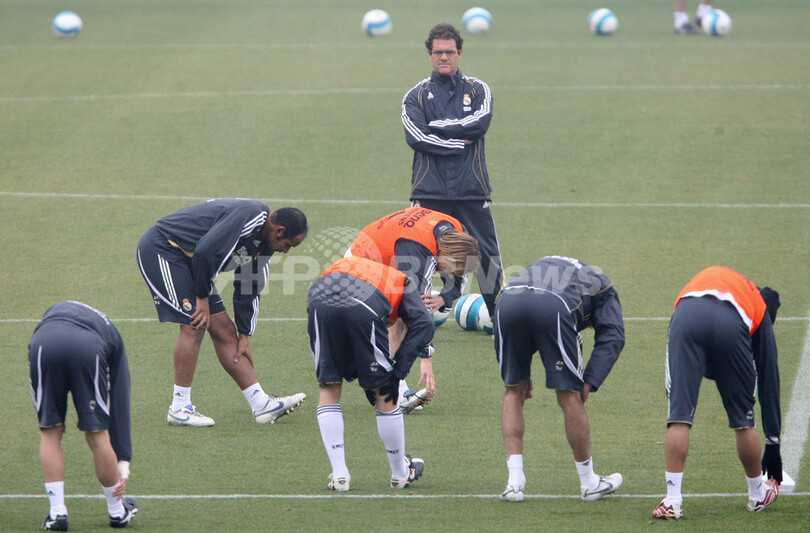 【マドリード/スペイン 6日 AFP】サッカー、スペイン・リーガエスパニョーラ1部・第21節でレバンテ(Levante)に敗れ、早くもシーズン7敗目を喫し4位に順位を落としたレアル・マドリード(Real Madrid)がトレーニングを行った。レアル・マドリードは、10日に行われる第22節でレアル・ソシエダ(Real Sociedad)と対戦する。写真は、ストレッチをする選手たちを見守るレアル・マドリードのファビオ・カペッロ(Fabio Capello)監督(中央奥)。(c)AFP/PHILIPPE DESMAZES