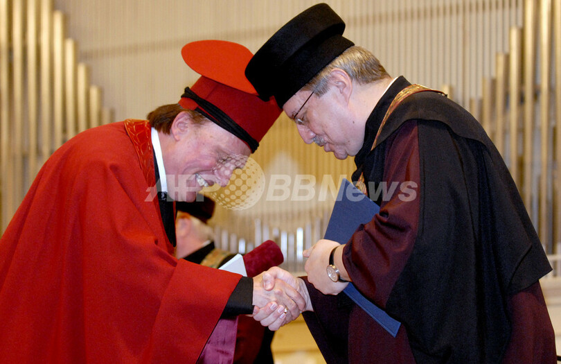 【ブルノ/チェコ 8日 AFP】有名指揮者のズデニェク・マーツァル(Zdenek Macal)が6日、ヤナーチェク音楽院(Janacek Academy of Music and Performing Arts、JAMU)から名誉博士号を授与された。ボストン、ロンドン、ベルリンといった160余りの名高いオーケストラで指揮を務めてきたマーツァルは、音楽祭でのパフォーマンスも知られ、スカラ座(Teatro alla Scala)などのオペラ劇場とも仕事をしてきた。1993年から2002年までニュージャージー交響楽団(New Jersey Symphony Orchestra)で指揮をとっていたマーツァルは2003年、チェコ・フィルハーモニー管弦楽団(Czech Philharmonic Orchestra)の首席指揮者に就任した。写真はマーツァル(右)と同音学院のVaclav Cejpek氏。(c)AFP/Otto Ballon Mierny