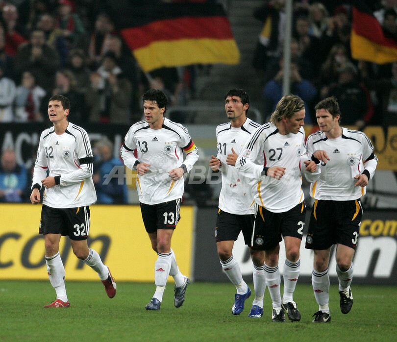 【デュッセルドルフ/ドイツ 7日 AFP】サッカー・親善試合、ドイツvsスイス。ドイツのトルステン・フリンクス(Torsten Frings)は、2点リードして迎えた後半21分にフリーキックを直接叩き込み勝利を決定づけるチーム3点目のゴールを奪った。試合はドイツが3-1でスイスを降した。写真は、ゴールを決めてフィリップ・ラーム(Philipp Lahm、左)とハイタッチを交わすフリンクス。(c)AFP/DDP/JUERGEN SCHWARZ