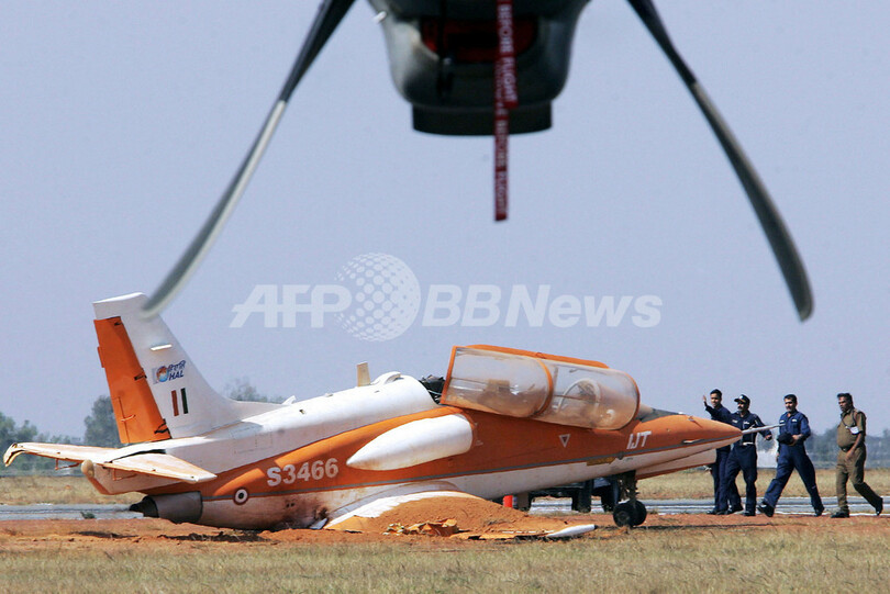 【Yelahanka/インド 9日 AFP】バンガロール(Bangalore)Yelahankaの空軍基地で開催されている航空ショー、「エアロインディア2007(Aero India 2007)」で8日、Hindustan Aeronautics Limited(HAL)社製のジェット練習機、Intermediate Jet Trainer(IJT)が滑走路に墜落した。同航空ショーは、増大する経済力に見合う軍事力強化を狙った海外との提携を目的にして、7日から開催されており、空軍による華麗な飛行ショーも披露される。写真は7日、墜落したIJT。(c)AFP/Dibyangshu SARKAR
