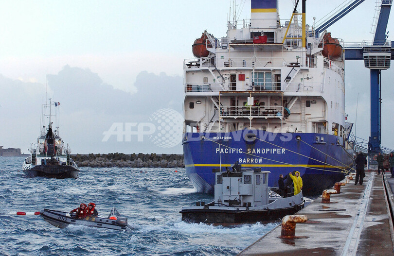 【ラアーグ/フランス 9日 AFP】西部ラアーグ(La Hague)にあるコジェマ(Cogema)社の再処理施設から8日、6つのコンテナに入った高レベル放射性廃棄物(ガラス固化体)が、日本に向かう貨物船、Pacific Sand Piperに積み込まれた。使用済み核燃料を再処理した際の高レベル放射性物廃棄物がフランスから日本に返還されるのは12回目で、今回が最後となる。写真は同日、高レベル放射性廃棄物(ガラス固化体)の入ったコンテナを貨物船に載せる作業員たち。(c)AFP/MYCHELE DANIAU