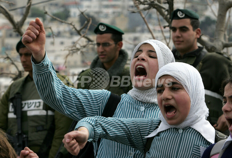 写真は同日、エルサレムのアルアクサ・モスク前で抗議するアラブ人イスラム教徒の学生たち。(c)AFP/AWAD AWAD