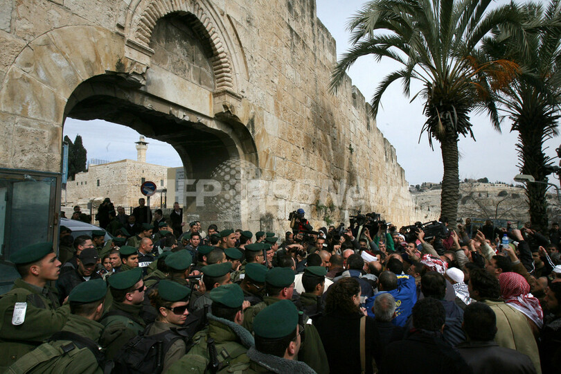 写真は同日、エルサレムのアルアクサ・モスク前で抗議するアラブ人イスラム教徒の学生たち。(c)AFP/AWAD AWAD