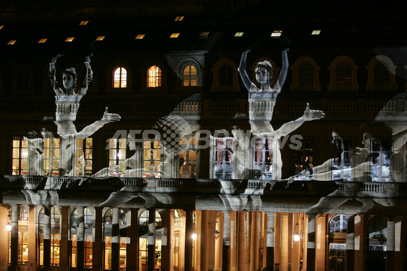 写真は8日、同ショーのリハーサルでパレロワイヤル(Palais Royals)に映し出されたダンサーたちの姿。(c)AFP/FRANCOIS GUILLOT