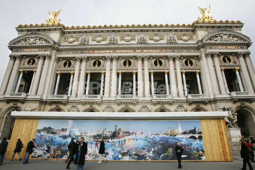 【パリ/フランス 10日 AFP】英国人アーティスト/彫刻家、David Machのアート作品が9日、オペラ座(Opera Garnier)正面に登場した。これはオペラ座正面の広場の工事現場を隠すために設置された。Machの作品は大量生産された製品などを基に作られるのが特徴。通常、素材には雑誌、新聞、マッチ棒やハンガーなどがある。彼の作品は今回の様な形で、公共の場に展示されることが多い。(c)AFP/BERTRAND GUAY