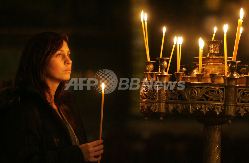写真は、9日、アレクサンダー・ネフスキー聖堂でろうそくを持つデモ参加者。(c)AFP/BORYANA KATSAROVA