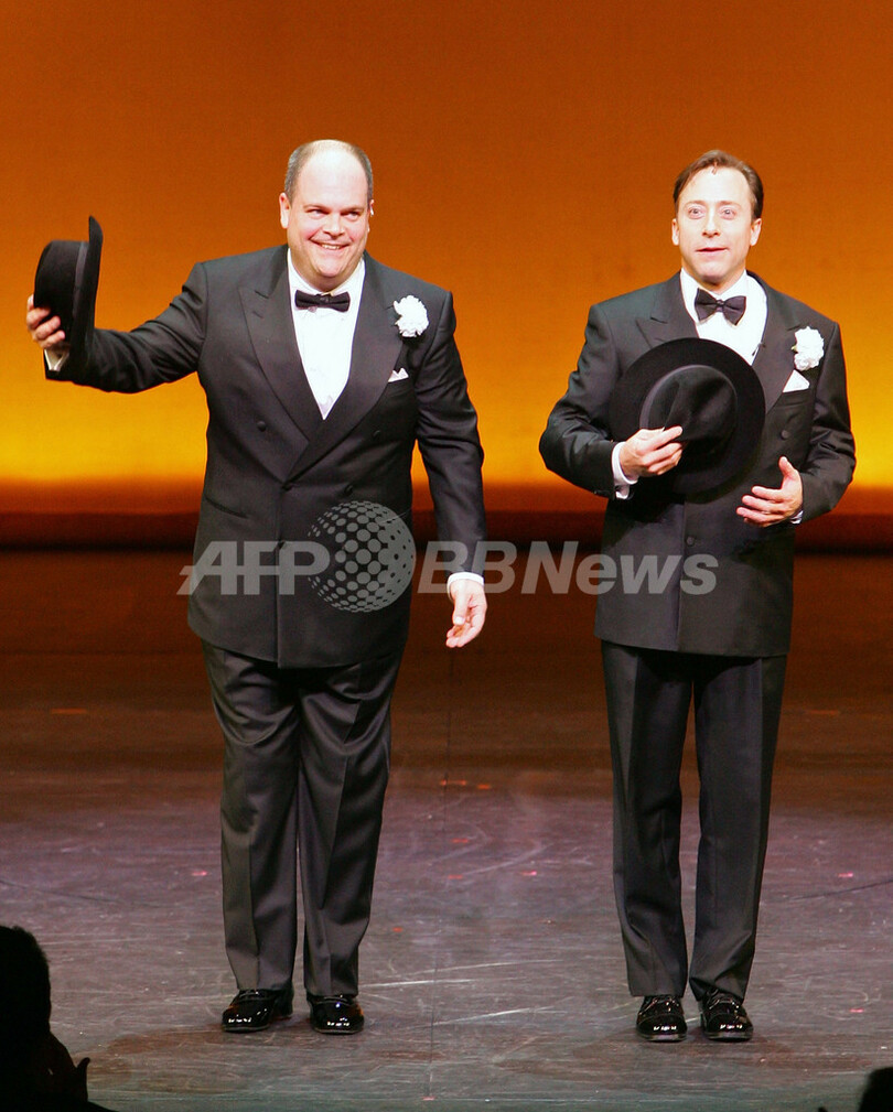 【ラスベガス/米国 11日 AFP】ブロードウェー・ミュージカルとしてトニー賞(Tony Awards)史上最多12部門を制覇した「プロデューサーズ(The Producers)」が9日、パリス・ラスベガス(Paris Las Vegas)で公演初日を迎えた。メル・ブルックス(Mel Brooks)が脚本、監督を務めた1968年の同名映画がもとになっているこのミュージカルは、ブロードウェーでの大ヒットを受けて、2005年に再映画化、日本でも公演されるなど、世界中で人気を博している。写真は、カーテンコールに登場した(左から)カルメン・ギア(Carmen Ghia)役のRich Affannato、ロジャー・デ・ブリー(Roger DeBris)役のデヴィッド・ハッセルホフ(David Hasselhoff)、マックス・ビアリストック(Max Bialystock)役のブラッド・オスカー(Brad Oscar)、レオ・ブルーム(Leo Bloom)役のLarry Raben、ウーラ(Ulla)役のレイ・ジンマーマン(Leigh Zimmerman)、フランツ・リーブキン(Franz Liebkind)役のフレッド・アップルゲート(Fred Applegate)。(c)AFP/Getty Images Ethan Miller