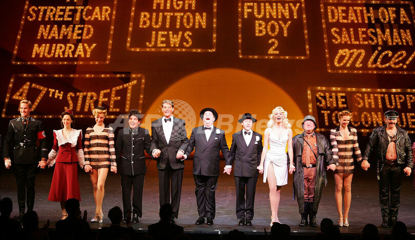 【ラスベガス/米国 11日 AFP】ブロードウェー・ミュージカルとしてトニー賞(Tony Awards)史上最多12部門を制覇した「プロデューサーズ(The Producers)」が9日、パリス・ラスベガス(Paris Las Vegas)で公演初日を迎えた。メル・ブルックス(Mel Brooks)が脚本、監督を務めた1968年の同名映画がもとになっているこのミュージカルは、ブロードウェーでの大ヒットを受けて、2005年に再映画化、日本でも公演されるなど、世界中で人気を博している。写真は、カーテンコールに登場した(左から)カルメン・ギア(Carmen Ghia)役のRich Affannato、ロジャー・デ・ブリー(Roger DeBris)役のデヴィッド・ハッセルホフ(David Hasselhoff)、マックス・ビアリストック(Max Bialystock)役のブラッド・オスカー(Brad Oscar)、レオ・ブルーム(Leo Bloom)役のLarry Raben、ウーラ(Ulla)役のレイ・ジンマーマン(Leigh Zimmerman)、フランツ・リーブキン(Franz Liebkind)役のフレッド・アップルゲート(Fred Applegate)。(c)AFP/Getty Images Ethan Miller