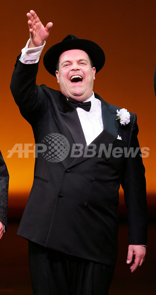 【ラスベガス/米国 11日 AFP】ブロードウェー・ミュージカルとしてトニー賞(Tony Awards)史上最多12部門を制覇した「プロデューサーズ(The Producers)」が9日、パリス・ラスベガス(Paris Las Vegas)で公演初日を迎えた。メル・ブルックス(Mel Brooks)が脚本、監督を務めた1968年の同名映画がもとになっているこのミュージカルは、ブロードウェーでの大ヒットを受けて、2005年に再映画化、日本でも公演されるなど、世界中で人気を博している。写真は、カーテンコールに登場した(左から)カルメン・ギア(Carmen Ghia)役のRich Affannato、ロジャー・デ・ブリー(Roger DeBris)役のデヴィッド・ハッセルホフ(David Hasselhoff)、マックス・ビアリストック(Max Bialystock)役のブラッド・オスカー(Brad Oscar)、レオ・ブルーム(Leo Bloom)役のLarry Raben、ウーラ(Ulla)役のレイ・ジンマーマン(Leigh Zimmerman)、フランツ・リーブキン(Franz Liebkind)役のフレッド・アップルゲート(Fred Applegate)。(c)AFP/Getty Images Ethan Miller