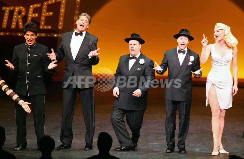 【ラスベガス/米国 11日 AFP】ブロードウェー・ミュージカルとしてトニー賞(Tony Awards)史上最多12部門を制覇した「プロデューサーズ(The Producers)」が9日、パリス・ラスベガス(Paris Las Vegas)で公演初日を迎えた。メル・ブルックス(Mel Brooks)が脚本、監督を務めた1968年の同名映画がもとになっているこのミュージカルは、ブロードウェーでの大ヒットを受けて、2005年に再映画化、日本でも公演されるなど、世界中で人気を博している。写真は、カーテンコールに登場した(左から)カルメン・ギア(Carmen Ghia)役のRich Affannato、ロジャー・デ・ブリー(Roger DeBris)役のデヴィッド・ハッセルホフ(David Hasselhoff)、マックス・ビアリストック(Max Bialystock)役のブラッド・オスカー(Brad Oscar)、レオ・ブルーム(Leo Bloom)役のLarry Raben、ウーラ(Ulla)役のレイ・ジンマーマン(Leigh Zimmerman)、フランツ・リーブキン(Franz Liebkind)役のフレッド・アップルゲート(Fred Applegate)。(c)AFP/Getty Images Ethan Miller