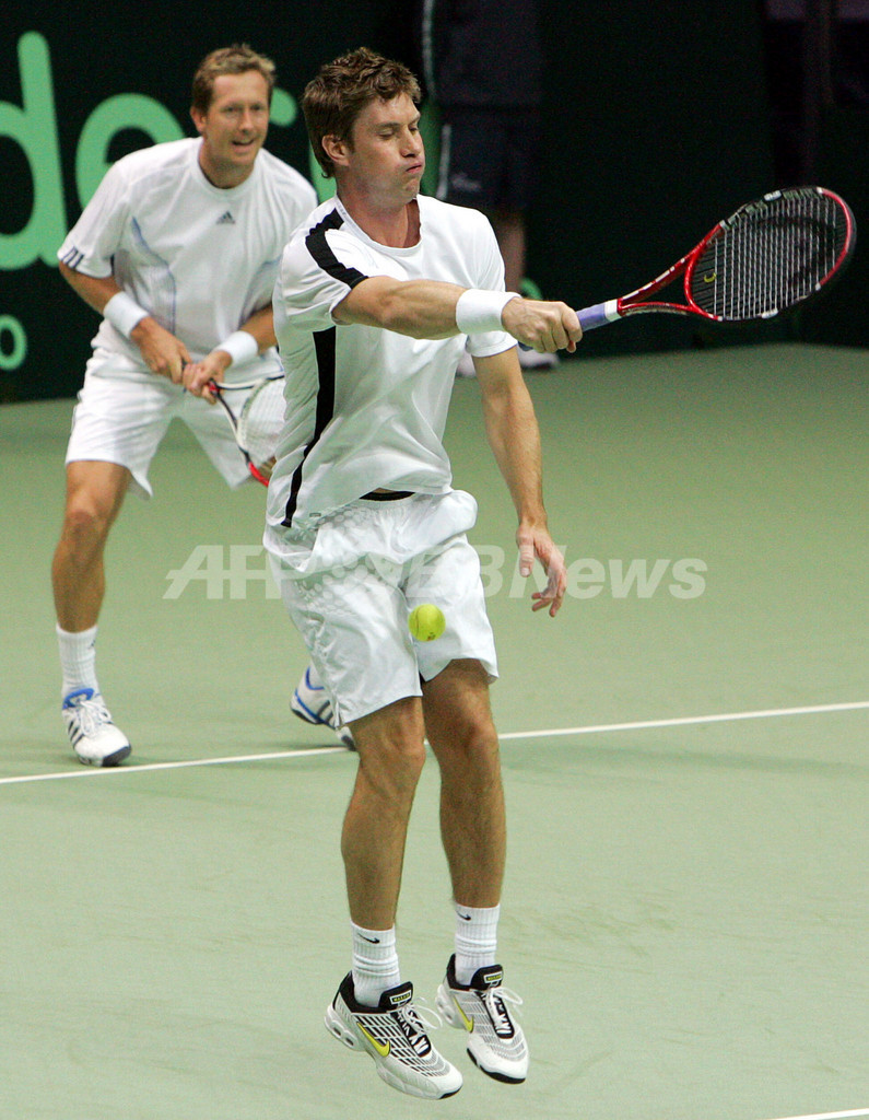 【ミンスク/ベラルーシ 10日 AFP】男子テニス・デビスカップ(2007 Davis Cup)、ワールドグループ2007・1回戦、ベラルーシvsスウェーデン。ベラルーシのマックス・ミルニー(Max Mirnyi)/ウラジミール・ボルチコフ(Vladimir Voltchkov)組は、第3試合のダブルスでスウェーデンのサイモン・アスペリン(Simon Aspelin)/ヨナス・ビョークマン(Jonas Bjorkman)組と対戦。ミルニー/ボルチコフ組はセットカウント3-1(7-5、4-6、7-5、6-3)で勝利を収め、ベラルーシの通算成績を1勝2敗とした。(c)AFP/VIKTOR DRACHEV