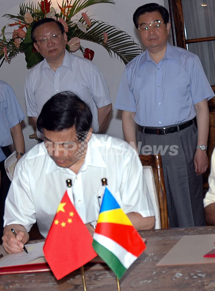 Hu Jintao)国家主席は最終訪問国セーシェルで物資や助成金を提供し、貿易協定などでも合意。5000万元(約7億8500万)の無償供与に加え、国際収支の支援に150万ドル(約1億8250万円)の供与を行った。写真は首都ビクトリア(Victoria)で同日、胡主席(右)が見守るなか合意文書に署名する薄熙来(
