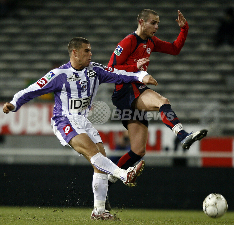 【トゥールーズ/フランス 10日 AFP】サッカー、フランス・リーグ1・第24節、トゥールーズ(Toulouse FC)vsリール(Lille)。試合は0-0で迎えた後半ロスタイム、リールのグレゴリー・タフォロー(Gregory Tafforeau)がオウンゴールにより失点してしまい、試合はそのまま終了、1-0でリールがトゥールーズに敗れた。写真はトゥールーズのローラン・バトル(Laurent Battles、左)とボールを競り合うリールのヨハン・カバイェ(Yohan Cabaye)。(c)AFP/PASCAL PAVANI