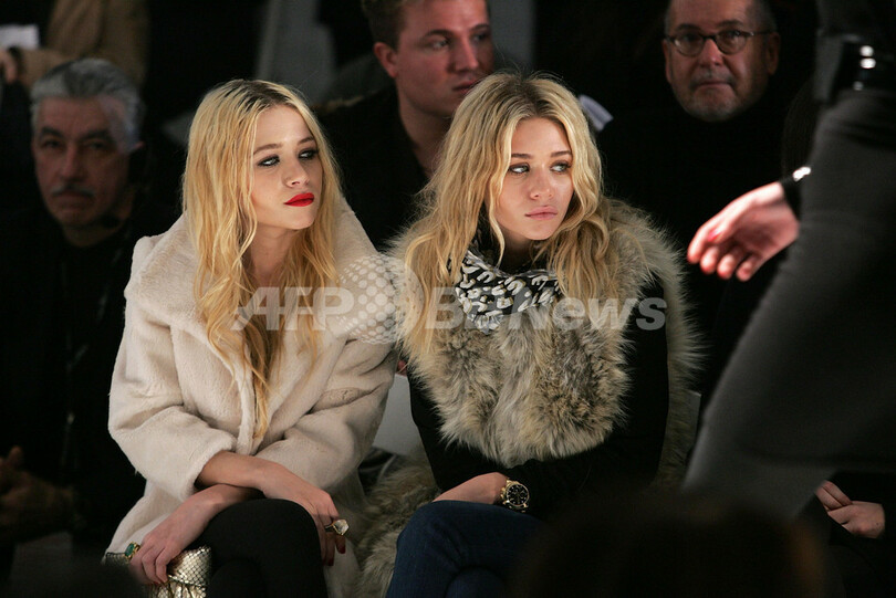 【ニューヨーク/米国 8日 AFP】2月2日より8日間、07/08年秋冬ニューヨーク・コレクションが、開催された。会期中には、約100ブランドがファッションショーや展示会形式で新作を発表。写真は、ジェニ・ケイン(Jenni Kayne)のショー会場に登場したメアリー・ケイト・オルセン(Mary-Kate Olsen、左)とアシュリー・オルセン(Ashley Olsen、右)。(c)AFP/Getty Image Peter Kramer
