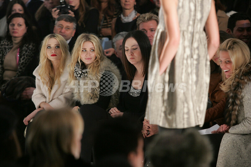 【ニューヨーク/米国 8日 AFP】2月2日より8日間、07/08年秋冬ニューヨーク・コレクションが、開催された。会期中には、約100ブランドがファッションショーや展示会形式で新作を発表。写真は、ジェニ・ケイン(Jenni Kayne)のショー会場に登場したメアリー・ケイト・オルセン(Mary-Kate Olsen、左)とアシュリー・オルセン(Ashley Olsen、右)。(c)AFP/Getty Image Peter Kramer