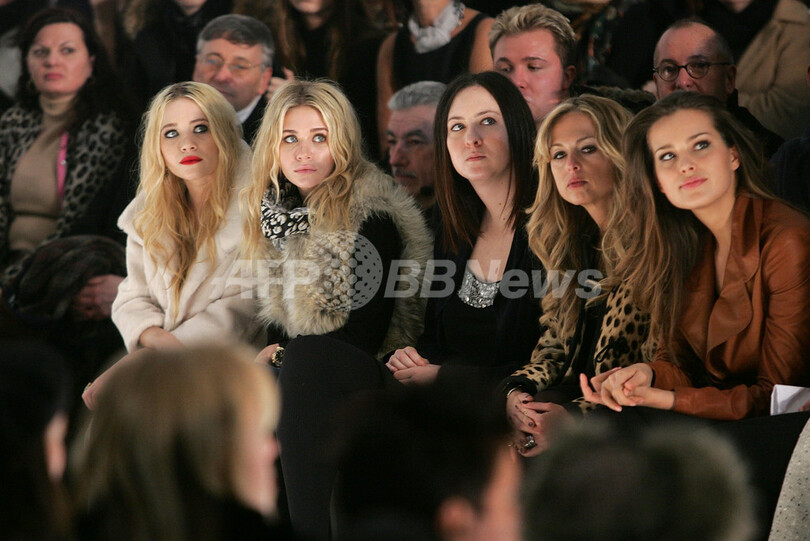 【ニューヨーク/米国 8日 AFP】2月2日より8日間、07/08年秋冬ニューヨーク・コレクションが、開催された。会期中には、約100ブランドがファッションショーや展示会形式で新作を発表。写真は、ジェニ・ケイン(Jenni Kayne)のショー会場に登場したメアリー・ケイト・オルセン(Mary-Kate Olsen、左)とアシュリー・オルセン(Ashley Olsen、右)。(c)AFP/Getty Image Peter Kramer