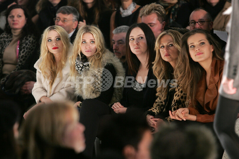 【ニューヨーク/米国 8日 AFP】2月2日より8日間、07/08年秋冬ニューヨーク・コレクションが、開催された。会期中には、約100ブランドがファッションショーや展示会形式で新作を発表。写真は、ジェニ・ケイン(Jenni Kayne)のショー会場に登場したメアリー・ケイト・オルセン(Mary-Kate Olsen、左)とアシュリー・オルセン(Ashley Olsen、右)。(c)AFP/Getty Image Peter Kramer