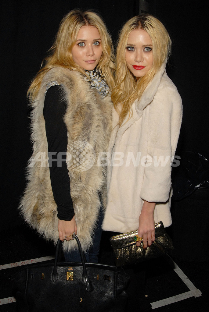 【ニューヨーク/米国 8日 AFP】2月2日より8日間、07/08年秋冬ニューヨーク・コレクションが、開催された。会期中には、約100ブランドがファッションショーや展示会形式で新作を発表。写真は、ジェニ・ケイン(Jenni Kayne)のショー会場に登場したメアリー・ケイト・オルセン(Mary-Kate Olsen、左)とアシュリー・オルセン(Ashley Olsen、右)。(c)AFP/Getty Image Peter Kramer