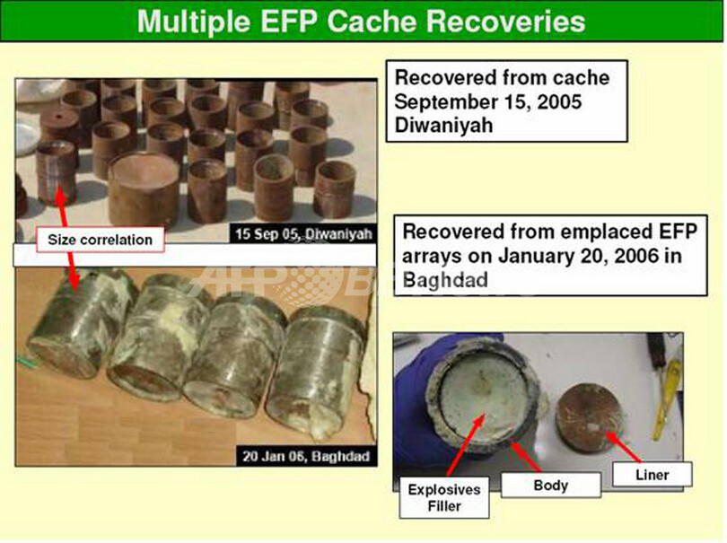 【バグダッド/イラク 11日 AFP】イラクに密輸されたイラン製の高性能爆弾により、2004年6月以降に死亡した米軍および同盟軍兵士の数は少なくとも170人に上り、負傷者は620人以上に達している。米国防省当局が11日に伝えた。多国籍軍の関係者は報道陣に対し「イランはイラクの武装組織に、爆発成形弾(EFP)などの武器を供給している」と語った。写真は同日、米軍当局により公開されたもので、バグダッドやディワニヤ(Diwaniyah)で発見されたEFP。(c)AFP