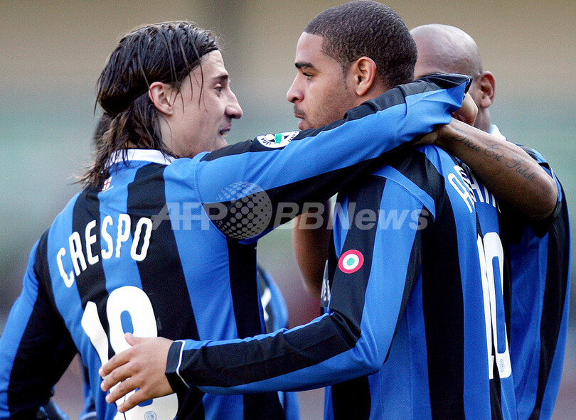 写真は、アドリアーノを祝福するクレスポ。(c)AFP/Paco SERINELLI