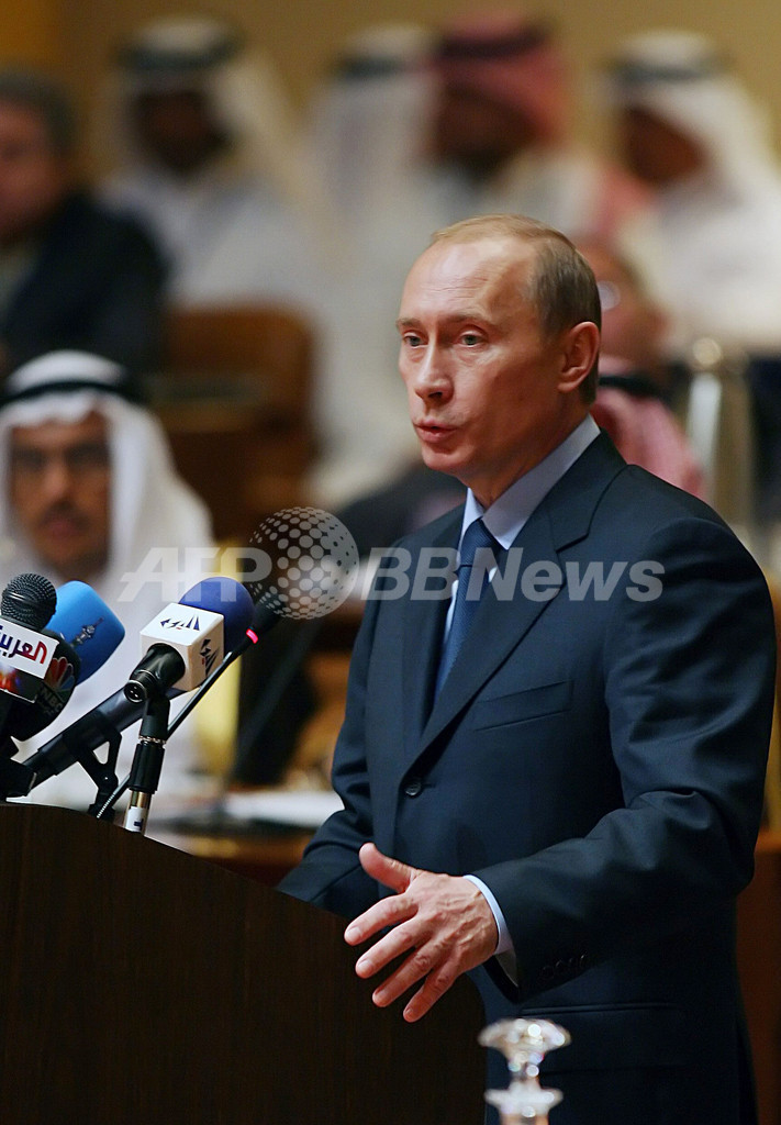 【リヤド/サウジアラビア 13日 AFP】中東歴訪中のロシアのウラジーミル・プーチン(Vladimir Putin)大統領は首都リヤド(Riyadh)で12日、サウジアラビアの原子力エネルギー開発に対する支援と、イスラム諸国との関係強化を約束した。プーチン大統領は特に前者をロシア、サウジアラビア両国間の有力な協力分野と位置づけている。米国の重要な同盟国であるサウジアラビアへのプーチン大統領の訪問は今回が初めて。写真は同日、リヤドで行われたロシア、サウジアラビア両国の財界人による会議で話すプーチン大統領。(c)AFP/HASSAN AMMAR