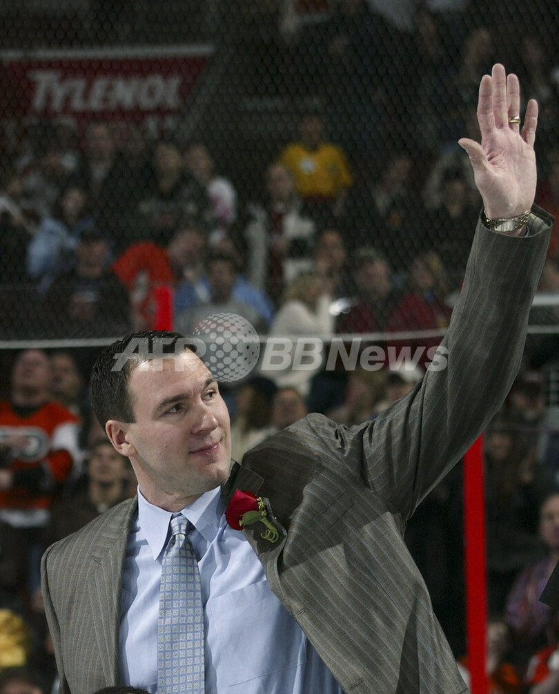 【フィラデルフィア/米国 12日 AFP】06-07NHL、フィラデルフィア・フライヤーズ(Philadelphia Flyers)vsデトロイト・レッドウィングス(Detroit Red Wings)戦の前に元フライヤーズの主将キース・プリモー(Keith Primeau)氏の引退セレモニーが行なわれた。試合はフライヤーズが6-1でレッドウィングスに快勝し、2連勝を飾った。写真は、引退セレモニーでファンの声援に手を振って応えるプリモー氏。(c)AFP/Getty Images Bruce Bennett