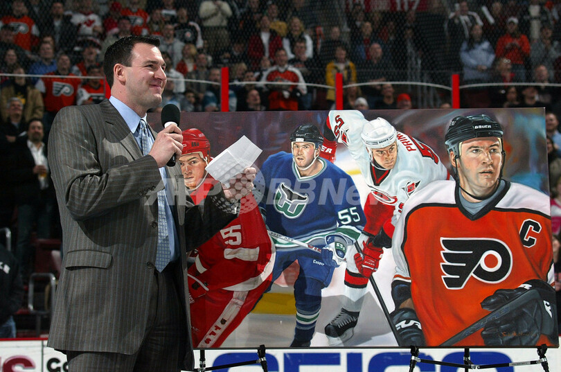 【フィラデルフィア/米国 12日 AFP】06-07NHL、フィラデルフィア・フライヤーズ(Philadelphia Flyers)vsデトロイト・レッドウィングス(Detroit Red Wings)戦の前に元フライヤーズの主将キース・プリモー(Keith Primeau)氏の引退セレモニーが行なわれた。試合はフライヤーズが6-1でレッドウィングスに快勝し、2連勝を飾った。写真は、引退セレモニーでファンの声援に手を振って応えるプリモー氏。(c)AFP/Getty Images Bruce Bennett