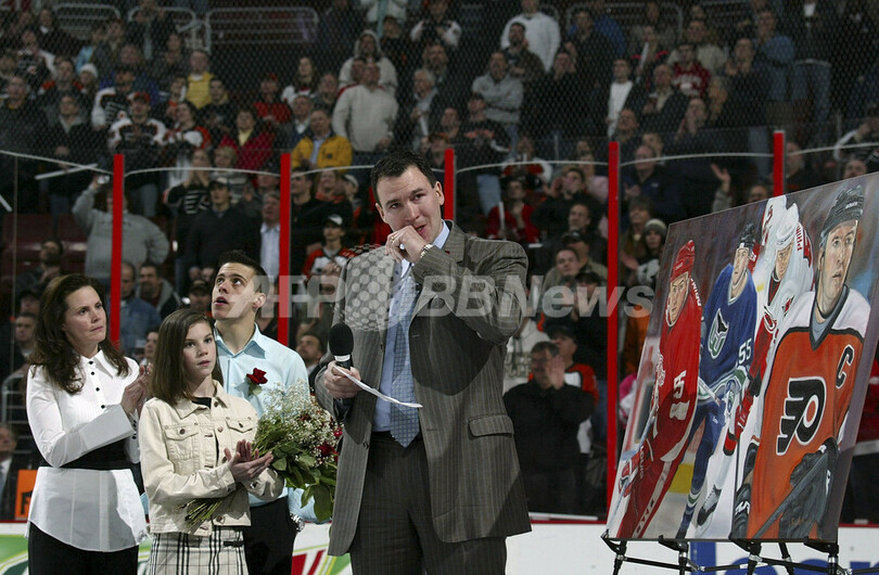 【フィラデルフィア/米国 12日 AFP】06-07NHL、フィラデルフィア・フライヤーズ(Philadelphia Flyers)vsデトロイト・レッドウィングス(Detroit Red Wings)戦の前に元フライヤーズの主将キース・プリモー(Keith Primeau)氏の引退セレモニーが行なわれた。試合はフライヤーズが6-1でレッドウィングスに快勝し、2連勝を飾った。写真は、引退セレモニーでファンの声援に手を振って応えるプリモー氏。(c)AFP/Getty Images Bruce Bennett