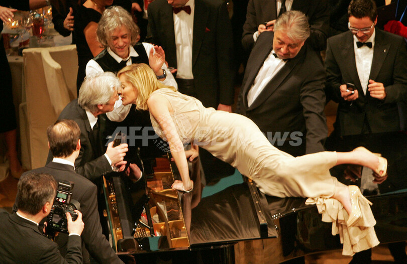 【ベルリン/ドイツ 14日 AFP】8日から18日まで開催される、第57回ベルリン国際映画祭(The 57th Berlin International Film Festival、Berlinale)で12日、映画製作者や関係者を招き、平和について考える恒例イベント「Cinema for Peace」が行われた。写真は同イベントでピアノ演奏を披露した米俳優リチャード・ギア(Richard Gere)にキスをする米女優のシャロン・ストーン(Sharon Stone)。(c)AFP/DDP/MICHAEL KAPPELER