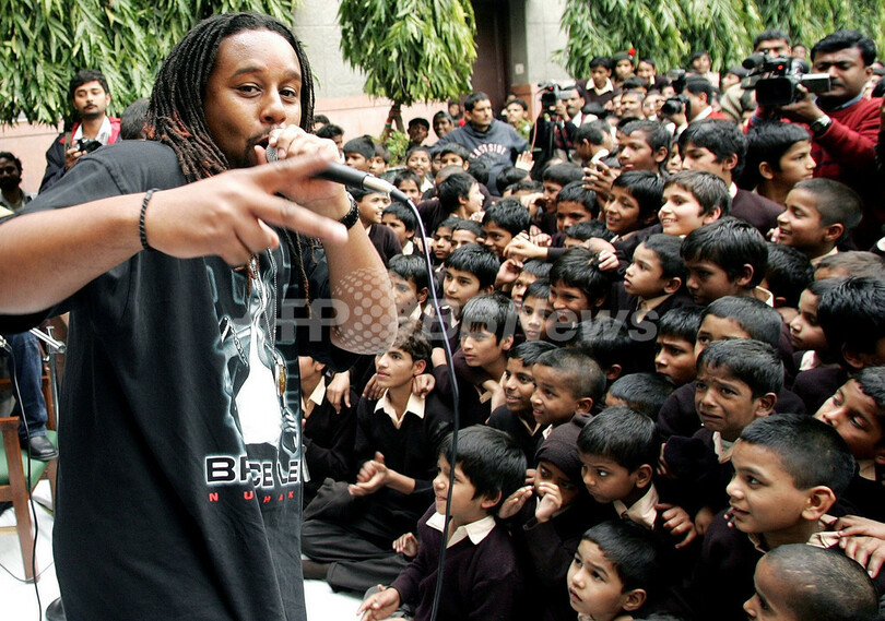 【ニューデリー/インド 14日 AFP】グラミー賞(Grammy Awards)受賞ラテン・ヒップホップ・グループ、オゾマトリ(Ozomatli)が13日、Arya Anathalaya孤児院を訪し、コンサートを開催した。ロサンゼルスを拠点にする同グループは米国の文化大使として、11日から21日までインド&ネパールで無料コンサート・ツアーを行う。写真は子供たちを前にパフォーマンスを披露する同グループ。(c)AFP/MANAN VATSYAYANA
