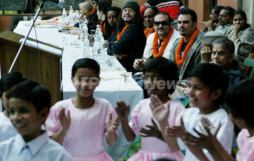 【ニューデリー/インド 14日 AFP】グラミー賞(Grammy Awards)受賞ラテン・ヒップホップ・グループ、オゾマトリ(Ozomatli)が13日、Arya Anathalaya孤児院を訪し、コンサートを開催した。ロサンゼルスを拠点にする同グループは米国の文化大使として、11日から21日までインド&ネパールで無料コンサート・ツアーを行う。写真は子供たちを前にパフォーマンスを披露する同グループ。(c)AFP/MANAN VATSYAYANA
